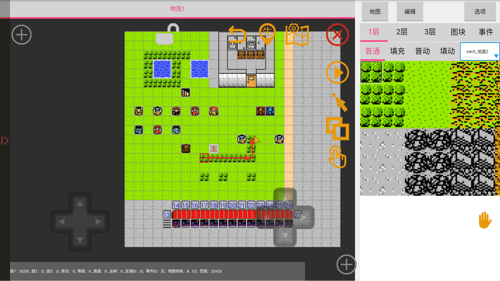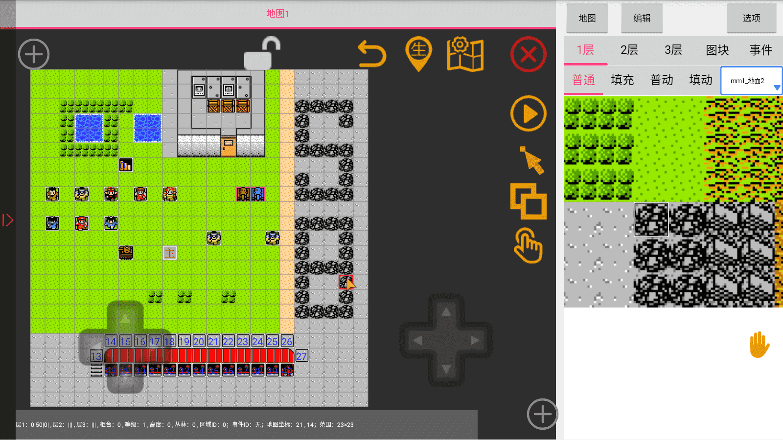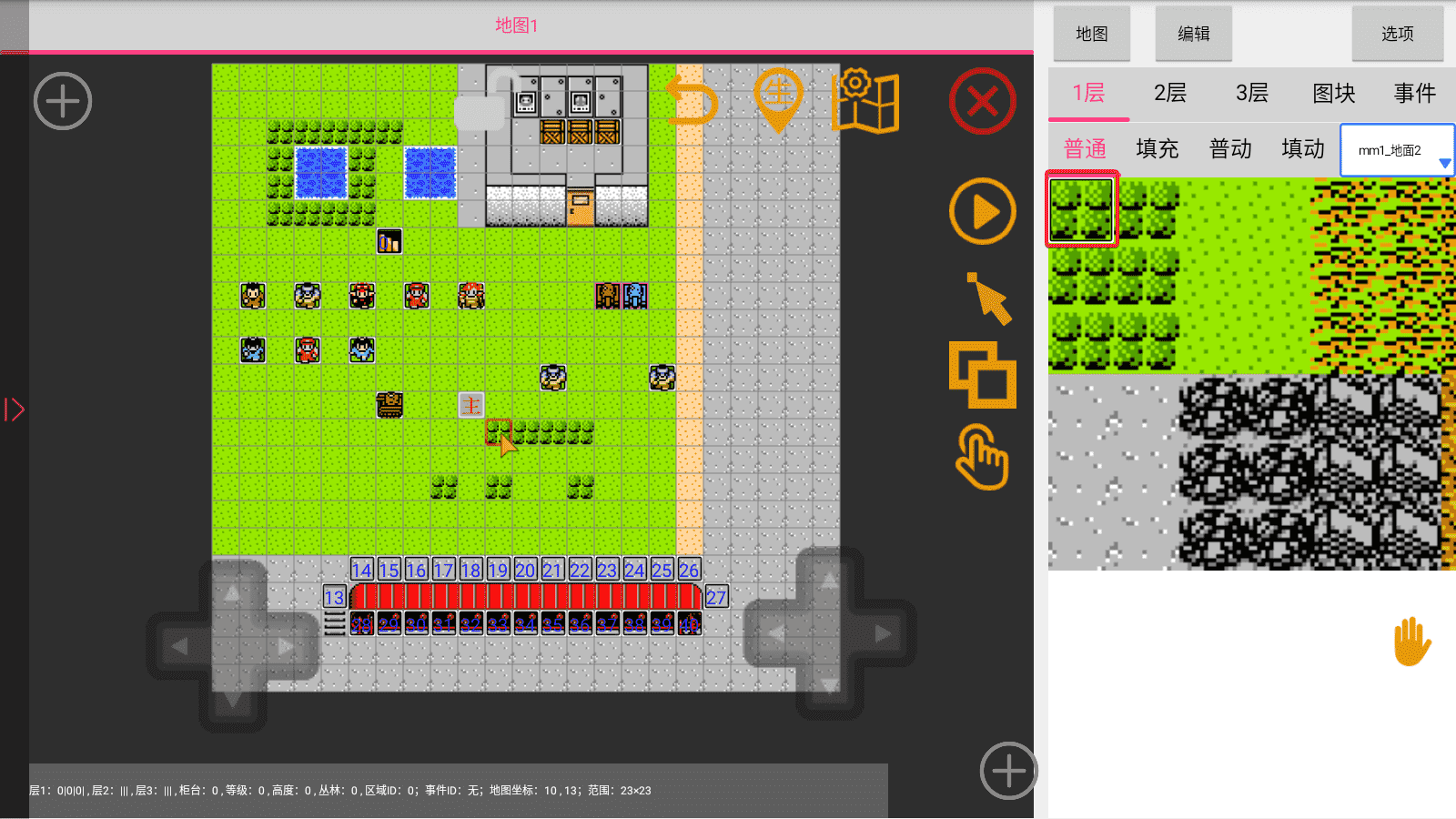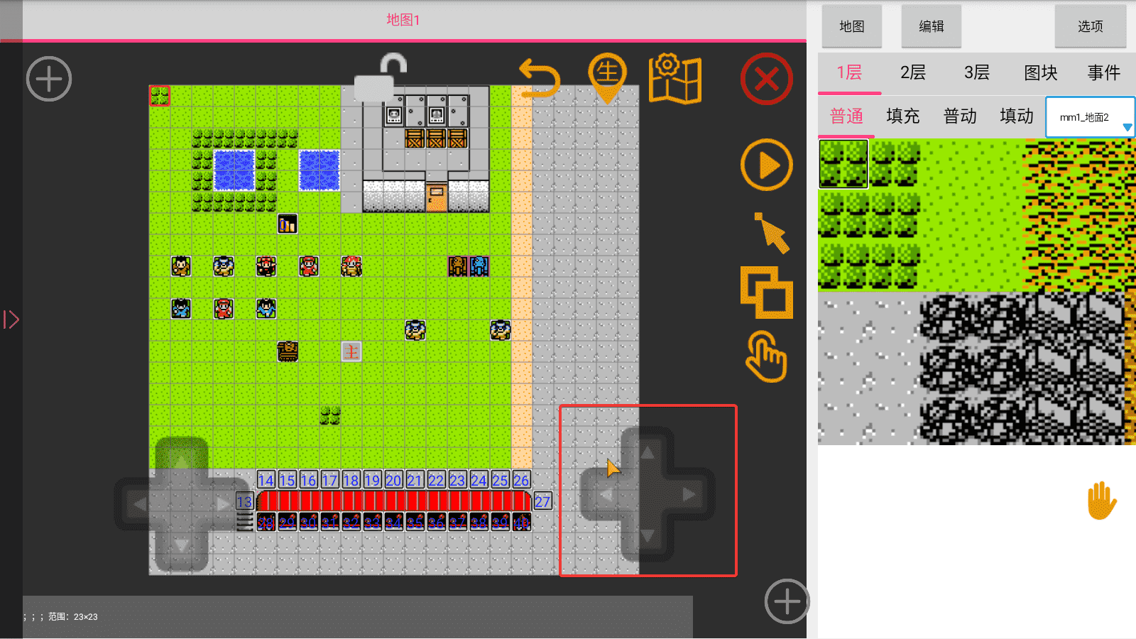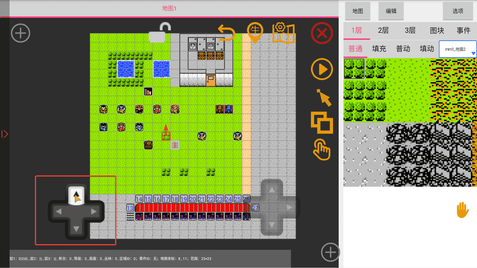双指可以放大缩小(一般人都会,所以不展示图片),手指轻点地图图块可以选中,也可以使用左边的方向键精准选中某一个图块: