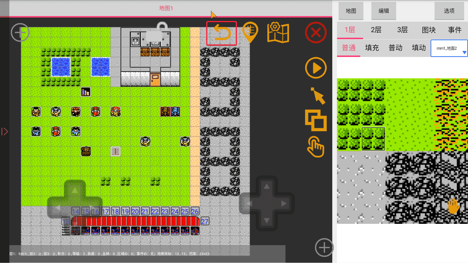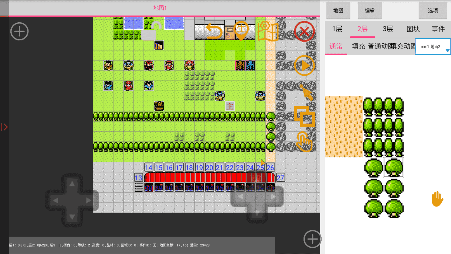 当我们需要绘制森林时(或者其他需要用到图层的地图),可能总会发现绘制出来的树木与周围的环境格格不入(有一层白边),这个时候我们就需要用到图层了,图层是一种覆盖性的东西(与绘画软件的图层一致),就比如说图层2的东西总会覆盖住图层1,但我们也可以利用这一特性来绘制出森林之类的地图,而操作也很简单,在右栏就可以切换了: