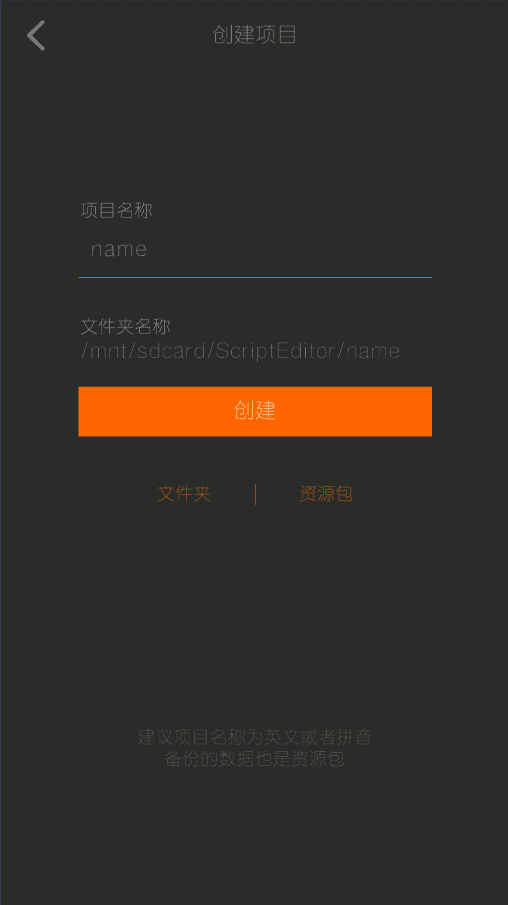 接着我们点击下方的+号,会进入一个创建项目页面,我们输入好项目的名称(非打包后名称,尽量使用英文,后续不可更改),点击创建即可。在以后你们会学到下面两个按钮的用途。