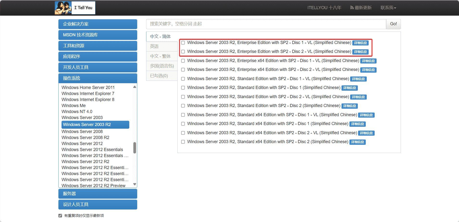 然后我们在操作系统分类中找到Windows Server 2003 R2,然后选择一个版本将CD1和CD2通过BT下载下来,在这里我选择的是Enterprise Edition(企业版):