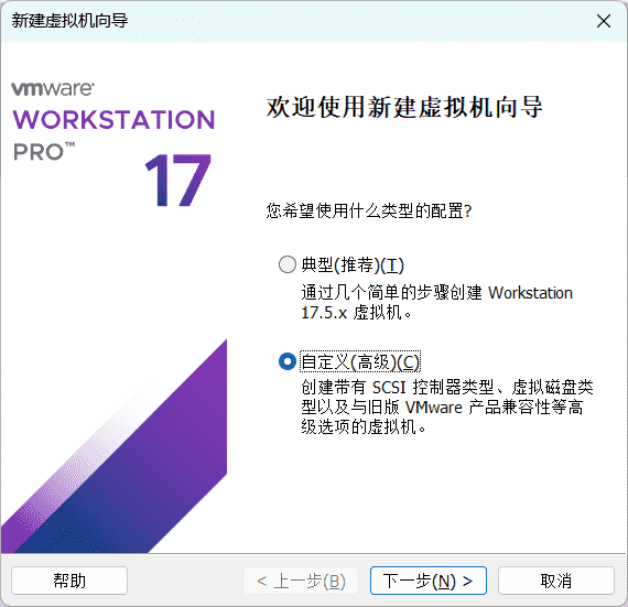 首先,进入VMware Workstation Pro 17,点击创建虚拟机并选择自定义:
