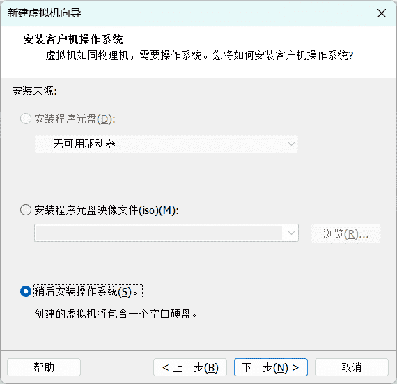 然后点击下一步,硬件兼容性我们不用管,安装来源我们选择稍后安装操作系统: