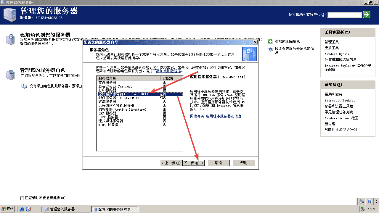 之后会进入到服务器角色页面我们选择应用程序服务器(IIS,ASP.NET),然后单击下一步:
