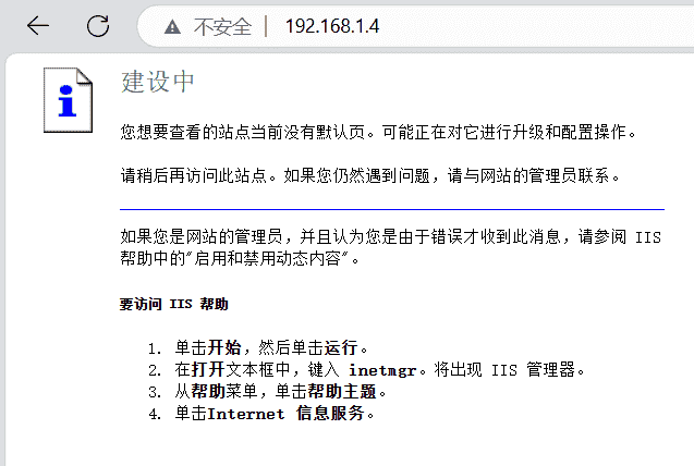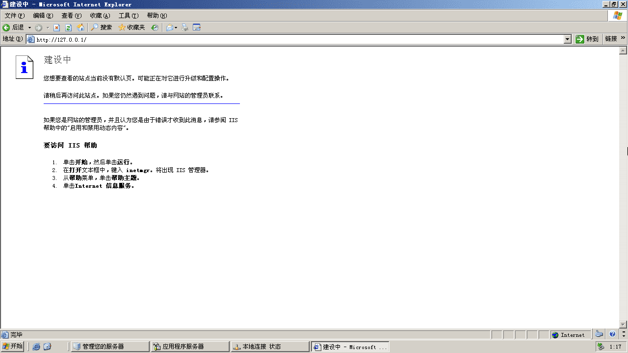 如果状态是正在运行的话,那么就证明网站已经可以正常访问了,我们可以在自带的IE中输入127.0.0.1,就可以看到“建设中”网页了: