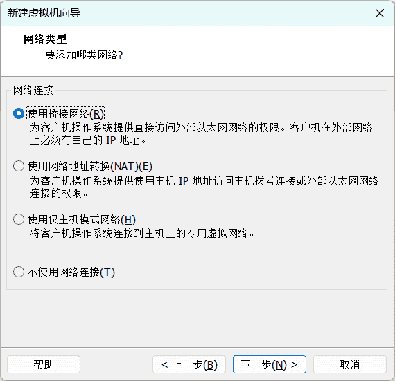 网络类型那里如果需要外部可以访问虚拟机创建的网页的话建议选择桥接模式: