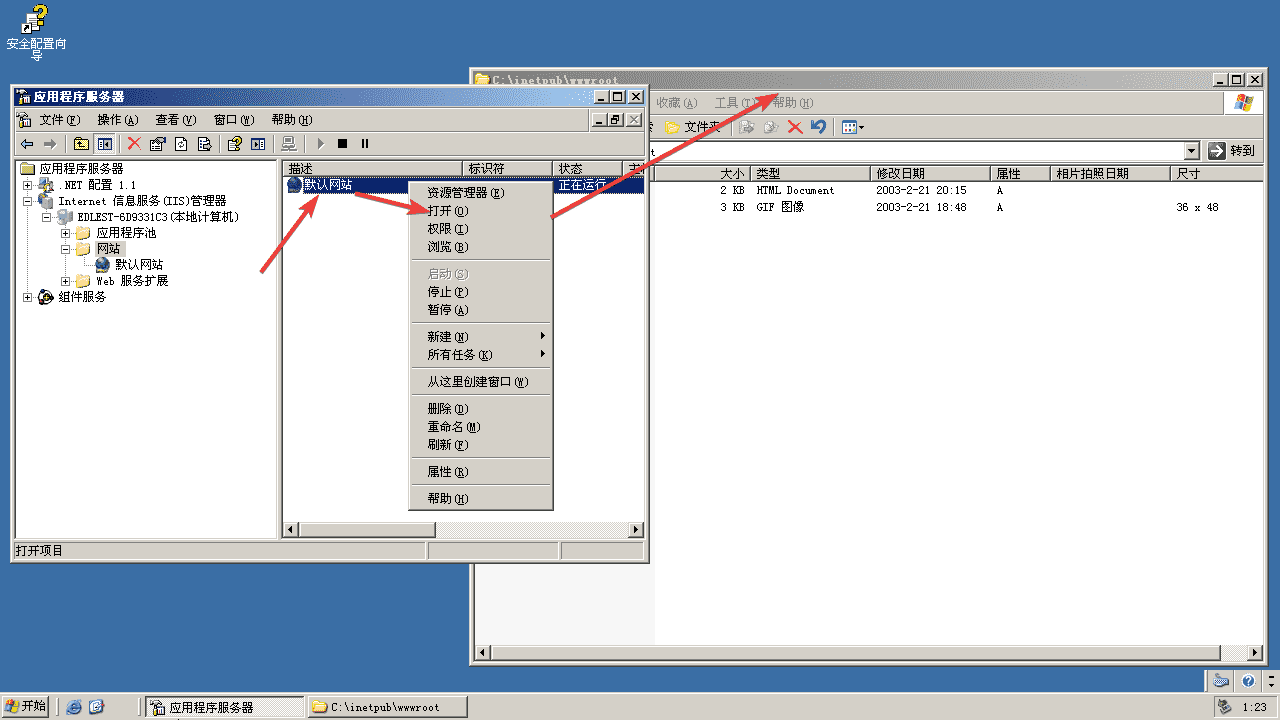 如果需要编辑网站,我们直接右键“默认网站”,然后点击打开,就会弹出资源管理器了: