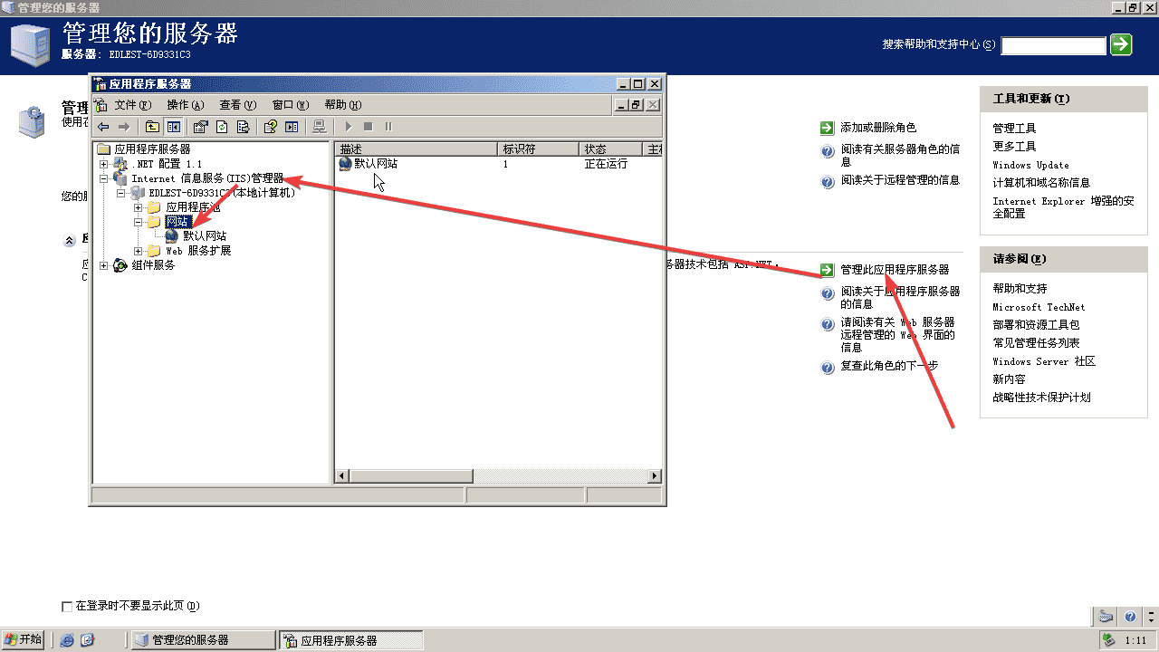 当应用程序服务器安装完成时,我们点击管理此应用程序服务器,然后展开IIS列表进入到网站之中,我们会发现,有一个默认网站:
