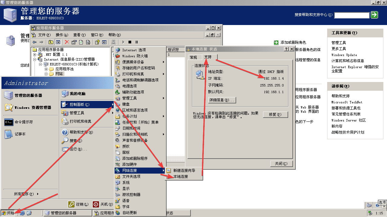 如果说你想要让局域网也能访问到你的网页,那么请先获取自己的局域网IP地址,打开开始菜单,点击控制面板,选择网络连接,里面有个本地连接,我们点击,然后点击支持,连接状态里面有个IP地址,这就是你的局域网IP地址了: